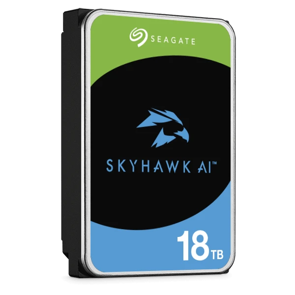 Seagate SkyHawk AI 18TB internal hard drive engineered for continuous 24/7 surveillance recording, featuring 7200 RPM speed, 256MB cache, SATA III 6 Gb/s interface, and 260 MB/s max sustained transfer rate. Optimized for AI-powered video analytics, network video recorders, and high-demand camera systems. Delivers exceptional reliability with 2 million hours MTBF, ensuring durable and smooth performance in smart surveillance environments.