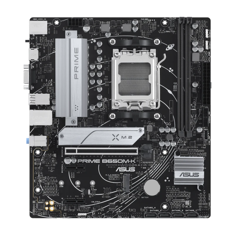 ASUS PRIME B650M-K is a compact Micro-ATX motherboard for AMD AM5 processors. Supports DDR5 memory, features PCIe 5.0, dual M.2 slots for fast NVMe SSDs, 2.5Gb Ethernet, HDMI output, USB 3.2 Gen2, and USB Type-C. Designed for performance, efficiency, and seamless compatibility.