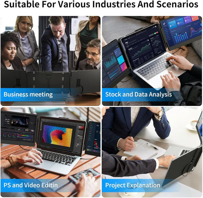 V2com S2 Triple 14-inch HD laptop monitor extender with IPS panels, 1080P Full HD resolution, ultra-slim design, anti-glare coating, and wide viewing angles. Enhance productivity with seamless multi-screen setup, easy USB-C connectivity, plug-and-play compatibility, and durable aluminum frame. Perfect for professionals, gamers, and remote workers seeking portable, high-quality display expansion.