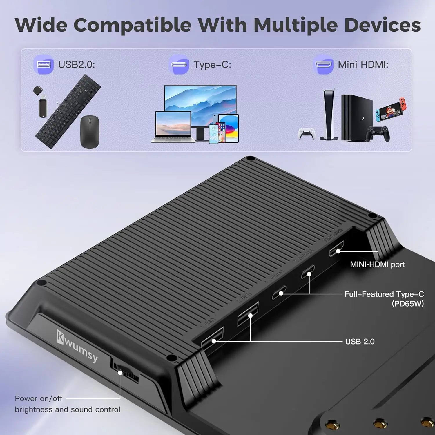 The portable laptop monitor features a 12.3” FHD IPS screen with 600 nits brightness and 1920 x 860p resolution. Customize settings like brightness, contrast, and backlight for a personalized viewing experience. This monitor supports both extend and duplicate modes, providing a wider, clearer, and more vivid visual field for various scenarios.