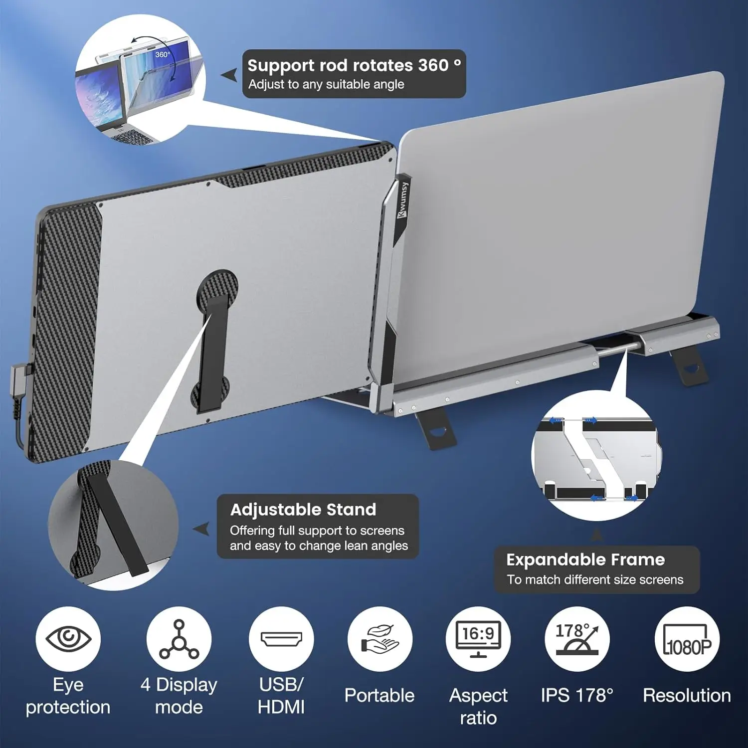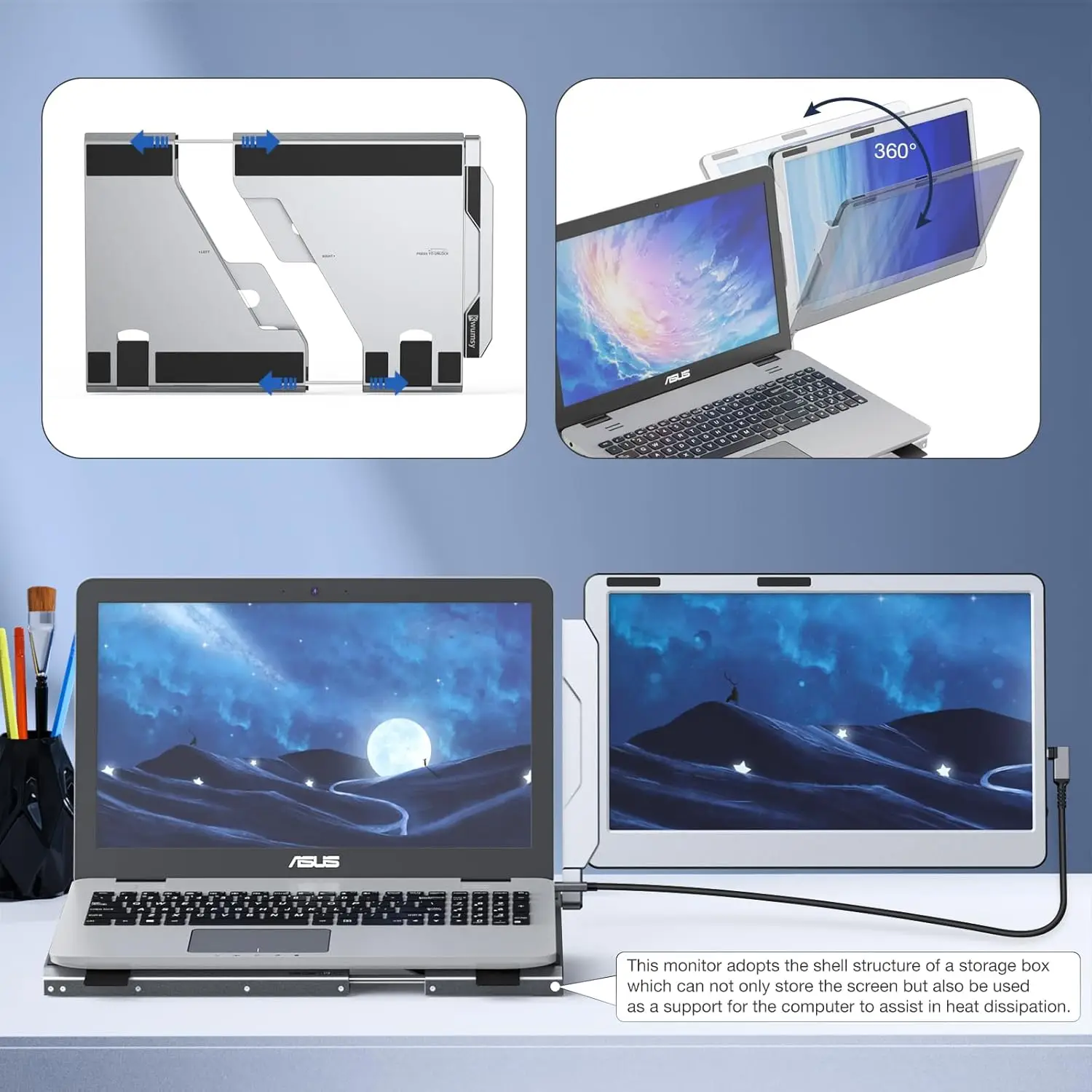 (keywords: V2COM F1, laptop monitor extender, dual screen, FHD IPS, plug‑and‑play, PD charging, 360° rotate)