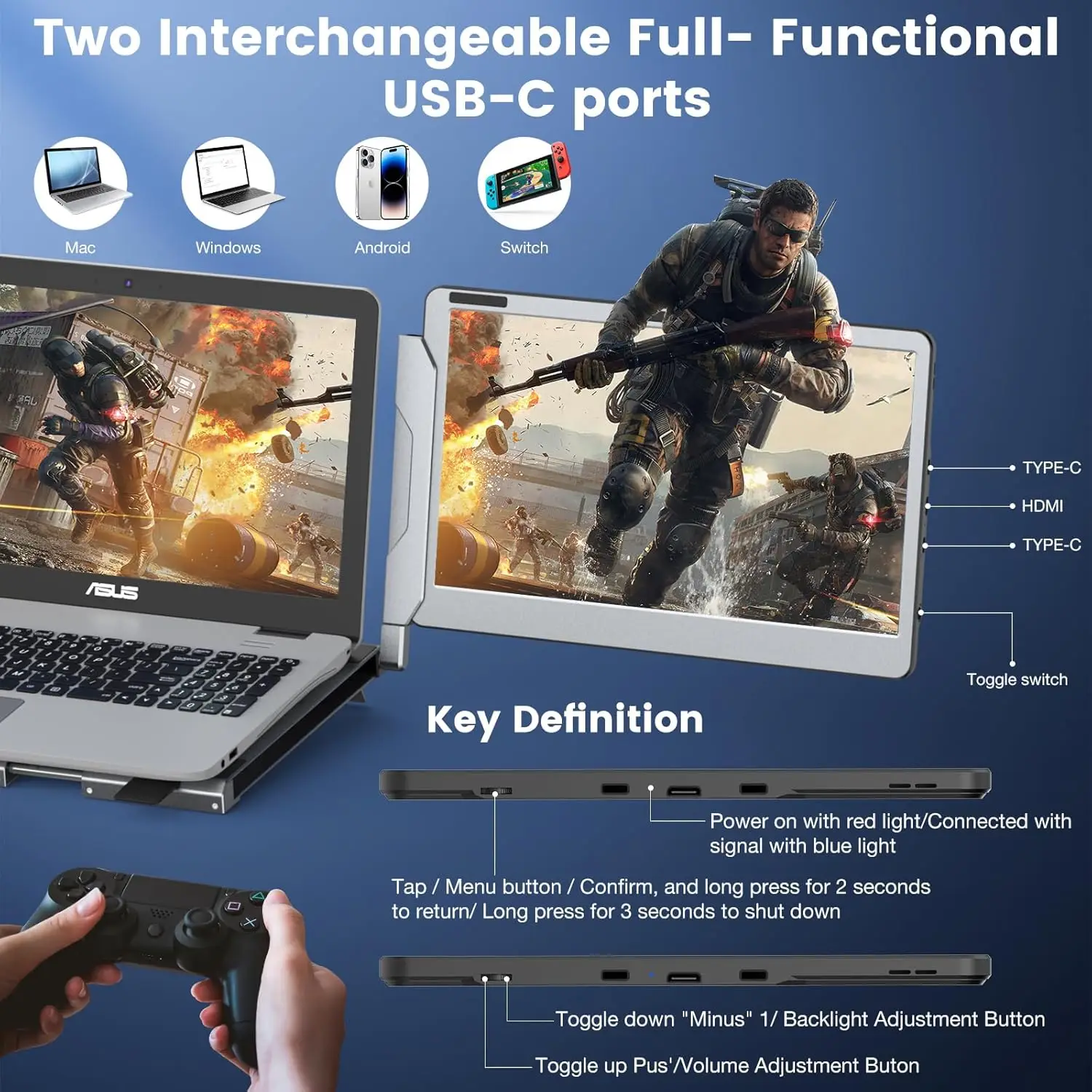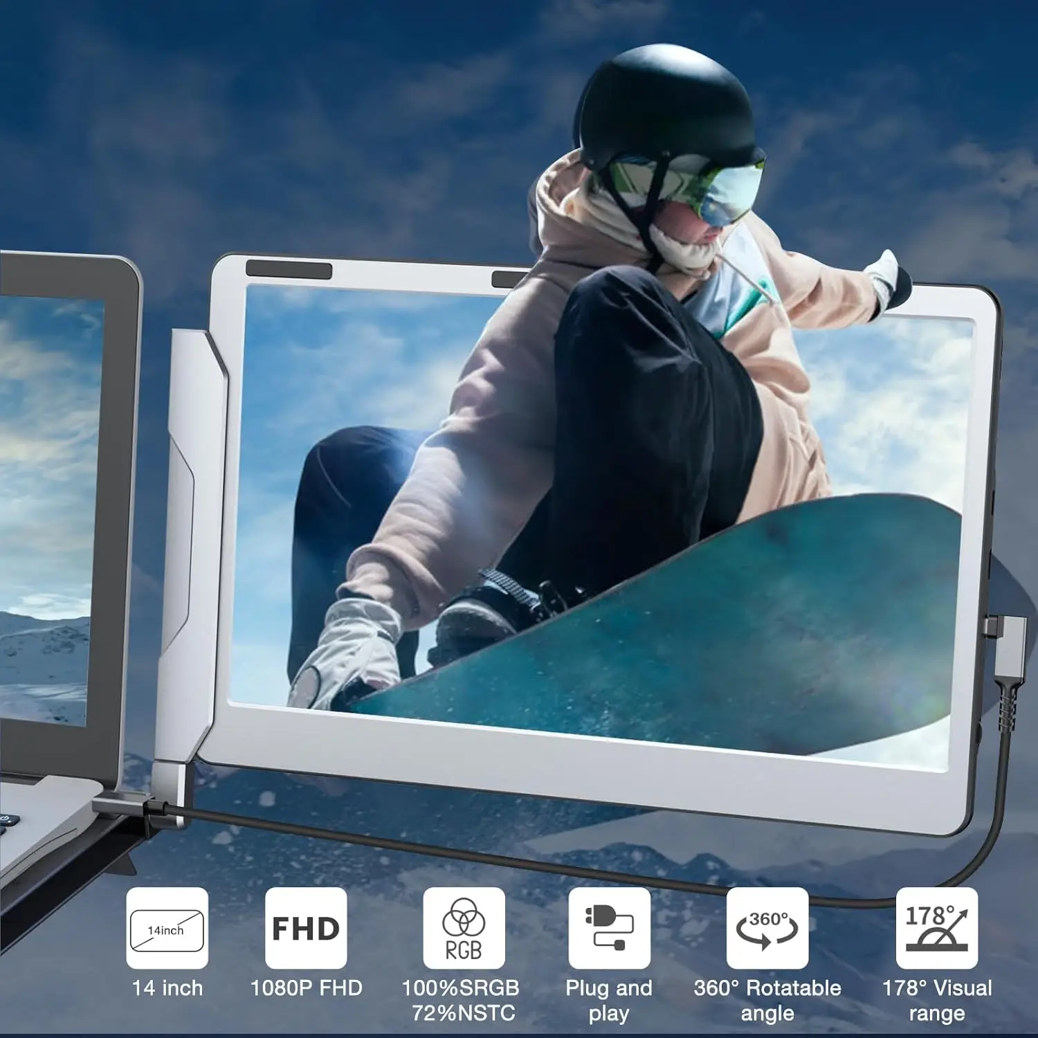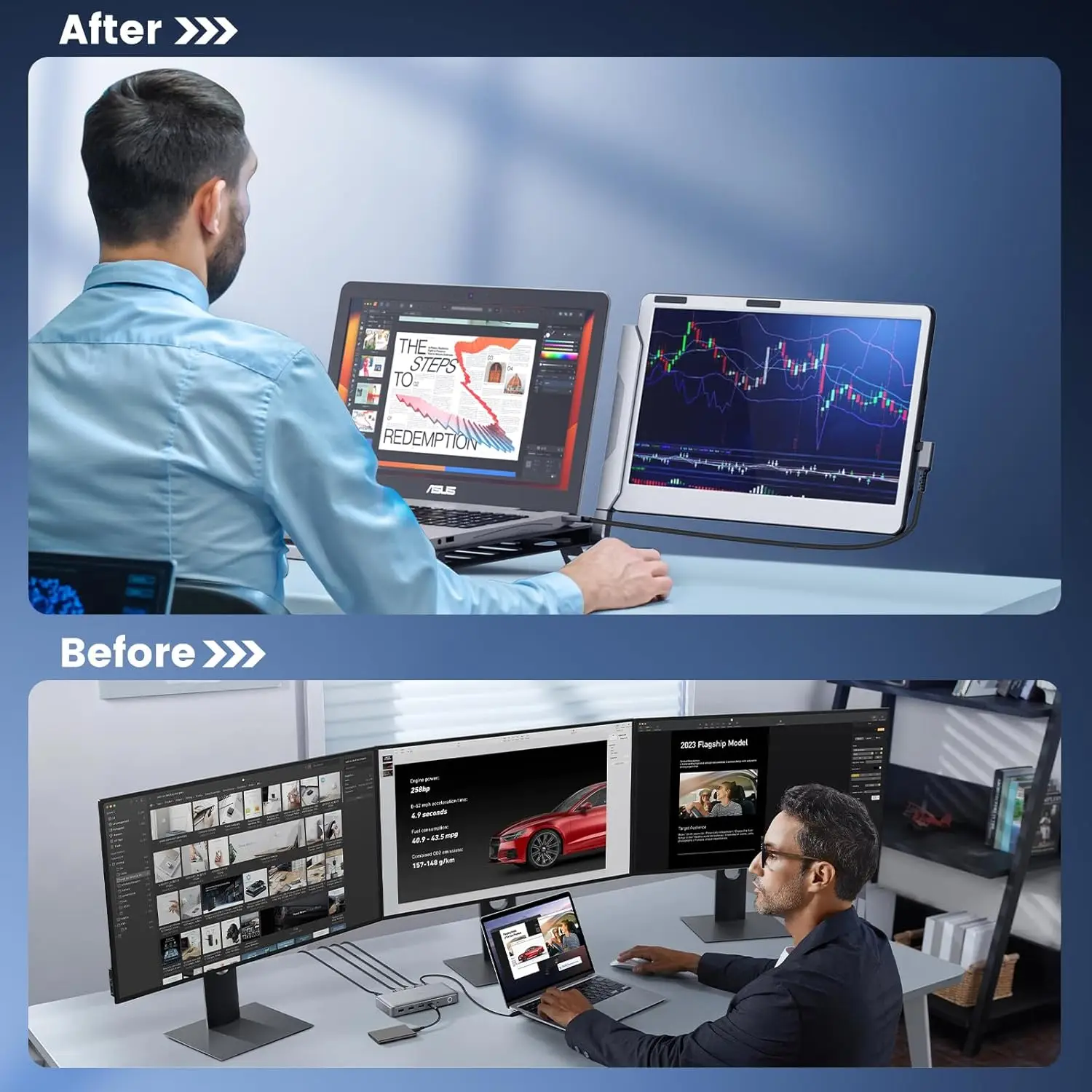 Enhance your mobile productivity with the V2COM F1 dual‑screen laptop extender, featuring dual 14″ FHD 1920×1080 IPS panels for crisp visuals, built‑in stereo speakers, ultra‑slim foldable frame, 360° horizontal & vertical rotation, and ergonomic heat‑dissipating stand. Plug-and-play via USB‑C DP Alt Mode, HDMI plus USB‑A power, no drivers required, supports PD charging up to 100W, and works natively with Windows, macOS (M1/M2/M3), Linux, Android, ChromeOS, Xbox, Switch. Ideal for coding, trading, video calls, gaming—boosts multitasking efficiency by up to 200%.