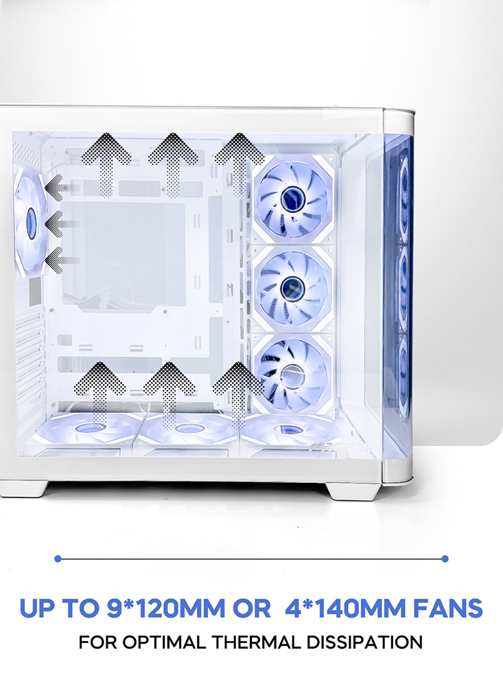 Motherboard Support ATX, M-ATX, ITX Case Material Tempered Glass Case Size 434 x 218 x 454 mm Carton Size 495 x 280 x 515 mm Max GPU Clearance 425mm PCIE Slot 7 Max CPU Cooler Clearance 170mm Drive Bays (SSD / HDD) 2 / 2 Fan Support (Top) 120mm x 3 / 140mm x 2 Fan Support (Side) 120mm x 3 Fan Support (Rear) 120mm x 1 Fan Support (Bottom) 120mm x 3 Radiator Support (Top) 240mm / 360mm Radiator Support (Side) 240mm Front I/O Ports USB 3.0 x 1, USB 2.0 x 2, Type-C, HD Audio, LED Switch, Reset, Power |