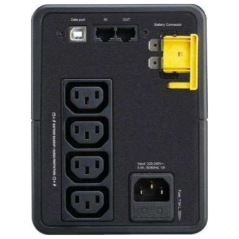Product or component type Uninterruptible power supply (UPS) Input Connection Type IEC 60320 C13 output connection type 4 IEC 60320 C13 Cable length 1.2 m Number of cables 1 Battery type Lead-acid battery Range of product Back-UPS Batteries & Runtime Run Time View Runtime Graph Efficiency View Efficiency Graph Number of battery filled slots 0 Number of battery free slots 0 Battery recharge time 8 h Battery voltage 12 V Battery capacity 7.0 Ah Battery life 3…5 year(s) Replacement battery RBC17 Battery graph comments Curve fit to measured runtime data. All measurements taken with new, fully charged batteries, at typical environmental conditions, with no electrical input and balanced resistive load (PF = 1.0) output. Extended runtime 0 General Provided equipment user manual Number of power module free slots 0 Number of power module filled slots 0 Redundant No Physical Colour Black Height 16 cm Width 12 cm Depth 35.5 cm Product weight 5.4 kg Mounting preference No preference Mounting mode Not rack-mountable Two post mountable 0 USB compatible No Input Network frequency 50/60 Hz +/- 5 Hz auto-sensing Plug standard C14 Input voltage limits 140...300 V Input Power Factor at Full Load 0.63 Output Maximum configurable power in W 410 W Output frequency 50/60 Hz +/- 1 Hz sync to mains UPS type Line interactive Wave type Stepped approximation to a sinewave Full load runtime 00:01:00 390 W Half load runtime 00:08:30 195 W Maximum configurable power in VA 750 VA Transfer time 6 ms typical : 10 ms maximum Conformance Product certifications CE CB EAC Standards EN/IEC 62040-1:2019/A11:2021 EN/IEC 62040-2:2006/AC:2006 EN/IEC 62040-2:2018 Environmental Ambient air temperature for operation 0…40 °C Relative humidity 0…95 % non-condensing Operating altitude 0...3000 m Ambient air temperature for storage -15…40 °C Storage Relative Humidity 0…95 % non-condensing Storage altitude 0…3000 m Acoustic level 40 dBA IP degree of protection IP20 Communications & Management control panel LED Status display with on line : on battery Surge Protection and Filtering Surge energy rate 273 J Packing Units Unit Type of Package 1 PCE Number of Units in Package 1 1 Package 1 Height 25 cm Package 1 Width 43 cm Package 1 Length 19.7 cm Package 1 Weight 5.9 kg SCC14 10731304410796 Contractual warranty Warranty 2 years repair or replace |