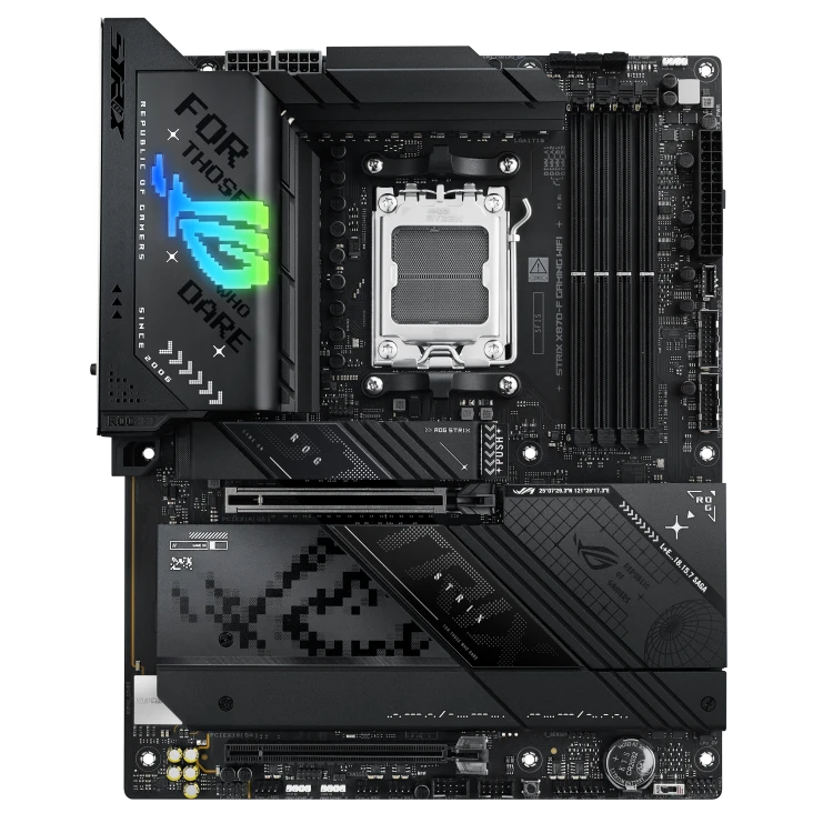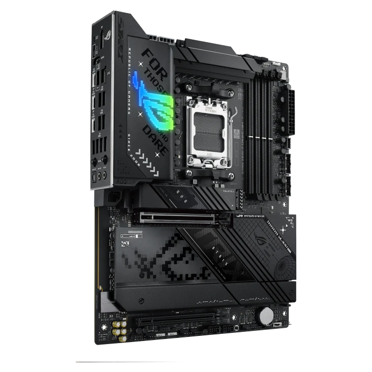 The ROG Strix X870-F is sleek and understated, empowering you to seamlessly combine it with a wide range of system components. Its deep black PCB and matching metallic heatsinks create a dark and intense look, while a touch of RGB lighting on the I/O shroud lets you either stay under the radar or make a bold statement.