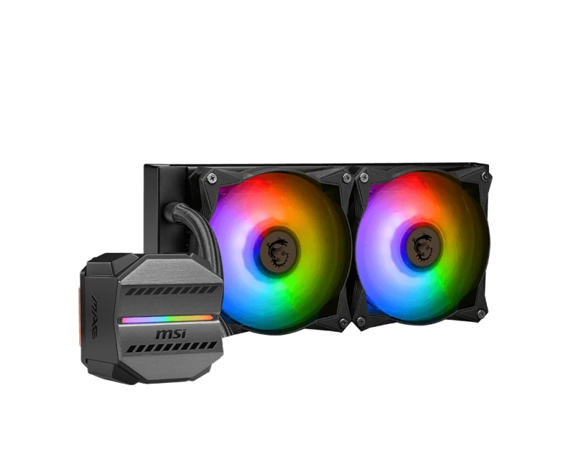 MSI MAG CORELIQUID M240 AIO liquid cooler with 240mm radiator, dual ARGB 120mm PWM fans for efficient, quiet cooling, customizable RGB lighting, and broad CPU socket compatibility. Perfect for gamers and PC enthusiasts seeking reliable thermal management.