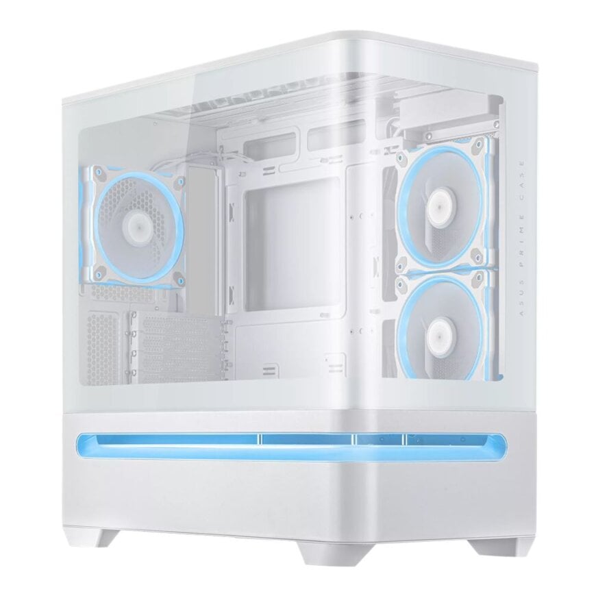 All components are housed in the sleek ASUS PRIME AP202 ARGB White mATX Case, designed for maximum airflow and minimalist aesthetics, complemented by ASUS PRIME MR120 Reverse ARGB Fans (3-Pack) for a whisper-quiet, dual-sided illumination setup.